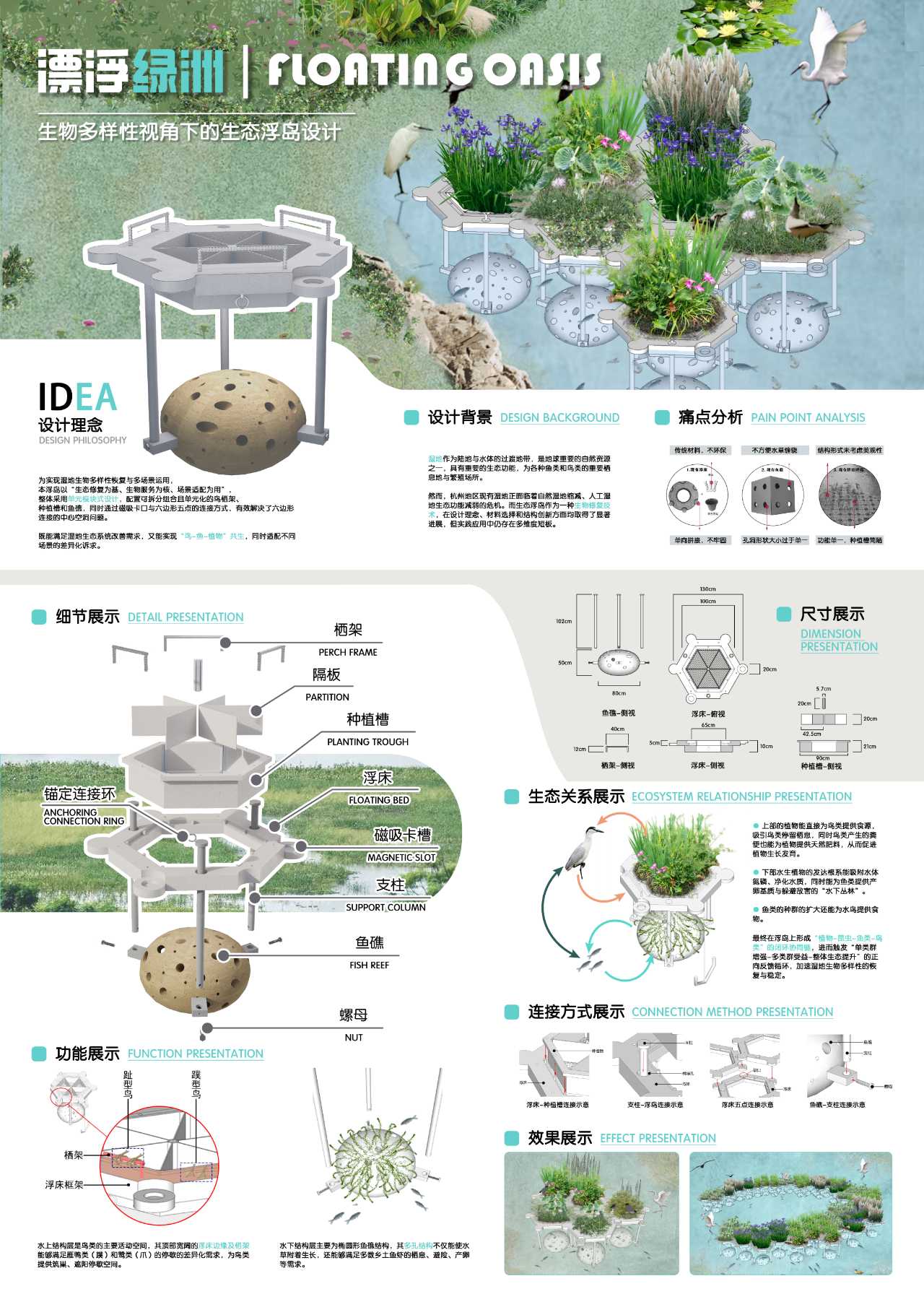 项目概述:“生态浮岛”项目通过技术创新和产业融合,为解决当前地区湿地退化及现有生态浮岛功能单一、长期稳定性不足等问题,本研究从生物多样性保护视角设计模块化的生态浮岛,最终实现“鸟-鱼-植物”共生与科普教育价值。