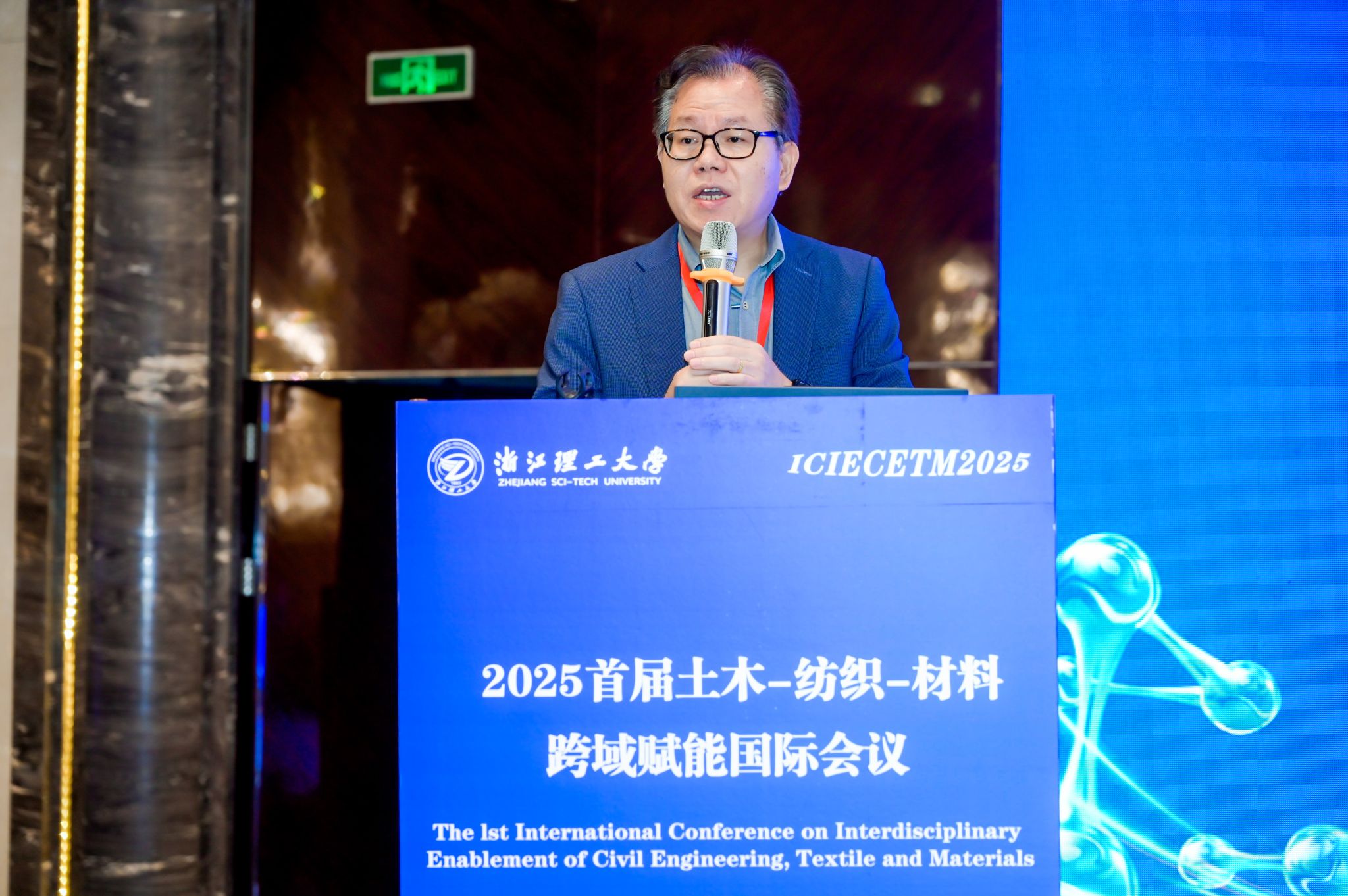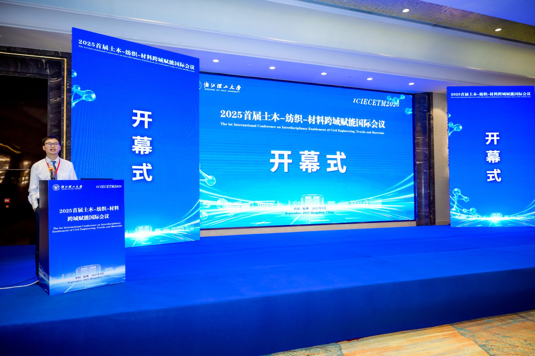 开幕式由浙江理工大学建筑工程学院学术院长顾晓强主持。浙江理工大学副校长周必彧致欢迎辞,介绍学校高水平大学建设进展,并强调中国作为全球规模最大的基建市场、最具活力的新材料研发基地和纺织产业创新中心,始终致力于推动跨领域协同发展。本次会议旨在汇聚全球智慧,推动土木、纺织与材料三大领域深度融合,服务国家‘双碳’战略与城市更新重大需求。